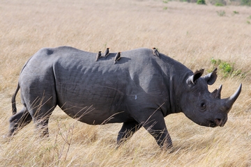 Dieses Nashorn lies sich von Gelbschnabelhackern pflegen. Diese sind ständige Begleiter der Nashörner. |
