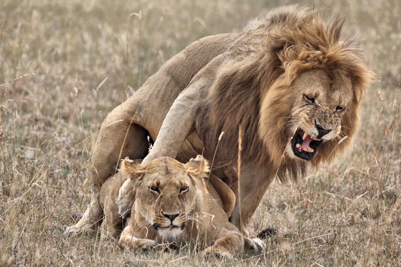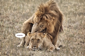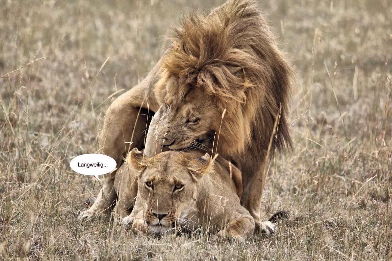 | Mir gelang die Aufzeichnung eines vollständigen Paarungs-Akts dieser Löwen. Nicht schwer zu schaffen, denn wenn die einmal dabei sind, tun sie es den ganzen Tag | ||